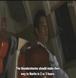 Koda and Shinkai talk about what they can do about trying to land at their primary airport, Narita. Koda says they will land elsewhere, take on some fuel and then take off again for Narita.