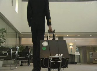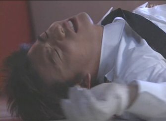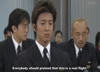 Ogawa is the last passenger (she must have been going through emotional terror during the drill). She goes down the shut but lands roughly; Koda starts to go after her and trips; Shinkai blocks him from falling but, in turn, falls over the side of the chute onto the hard floor.