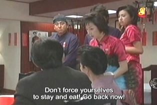 A pervert was feeling up Ayame's leg and she told him to stop but he didn't so she kicked him so hard he and his chair fell over. The Dragon Lady blames Ayame since she had on a sort of high-cut cheongsam.