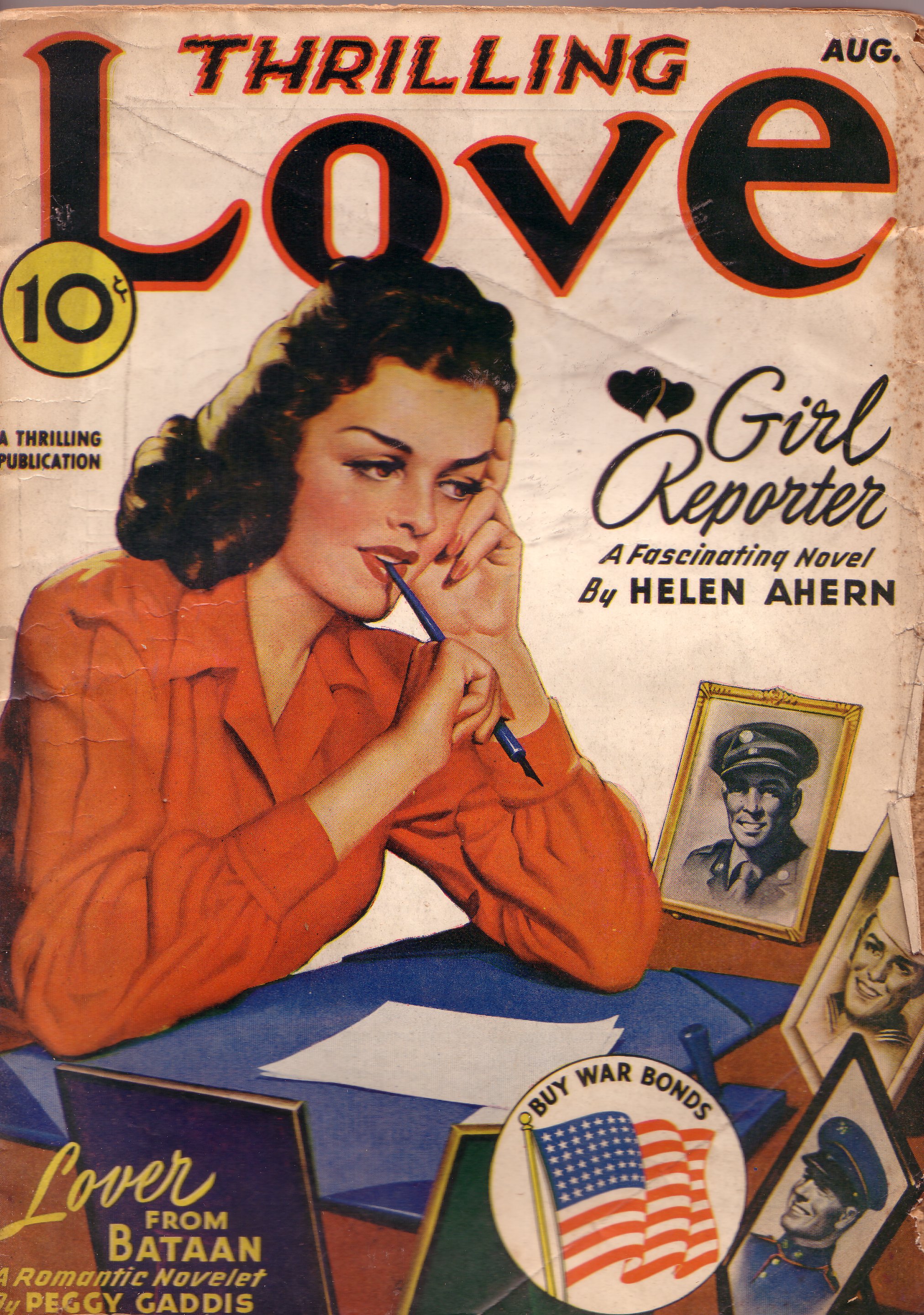 Notice the “Buy War Bonds” image on the frong cover. All three pictures on the woman's desk are soldiers, and Bataan is mentioned on the cover, showing how much emphasis this cover is giving to World War II. A good portion of this issue is actually factual material related to women and the war effort.