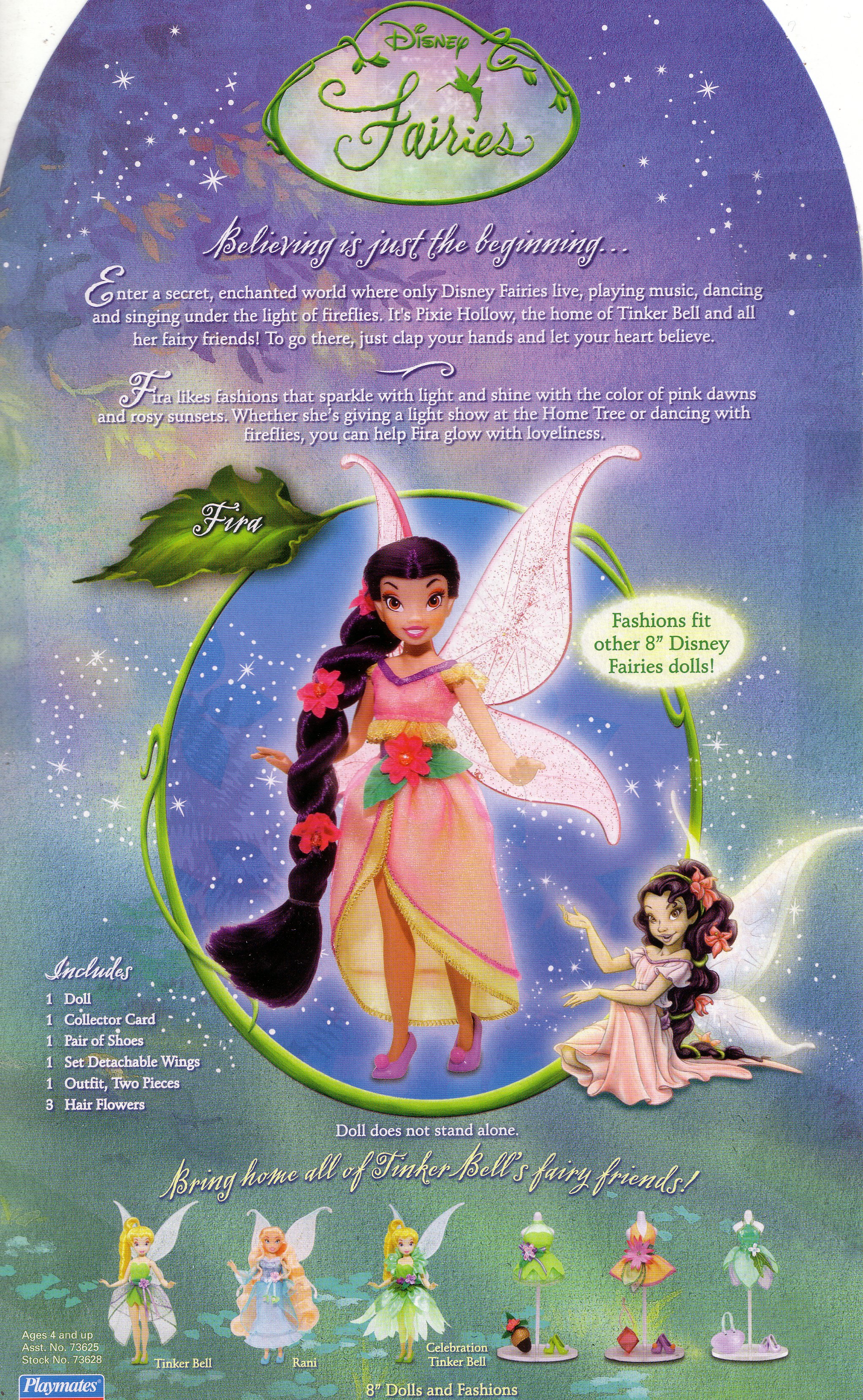 Fira is a light talent fairy in charge of others and a severe problem arises when the lightning bugs become ill and are no longer able to help light Pixie Hollow. She and the other light-talent fairies will have to work extra-hard to fill in for them.