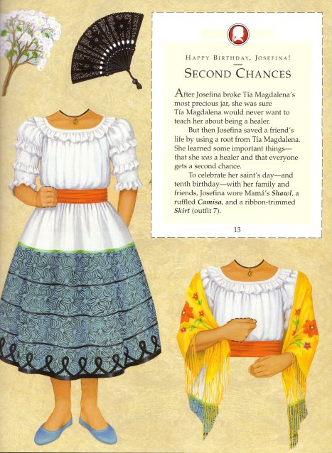Josefina was a young girl living in the area of New Mexico but before it was taken over by the U.S. And made into a state. As in all the other dolls in the series, there are informational sections that can be made into a mini-booklet; a two-sided cardboard display; various dolls, costumes (with information) and accessories, all allowing a young girl to have fun with the dolls and yet to learn something about history and fashion at the same time.