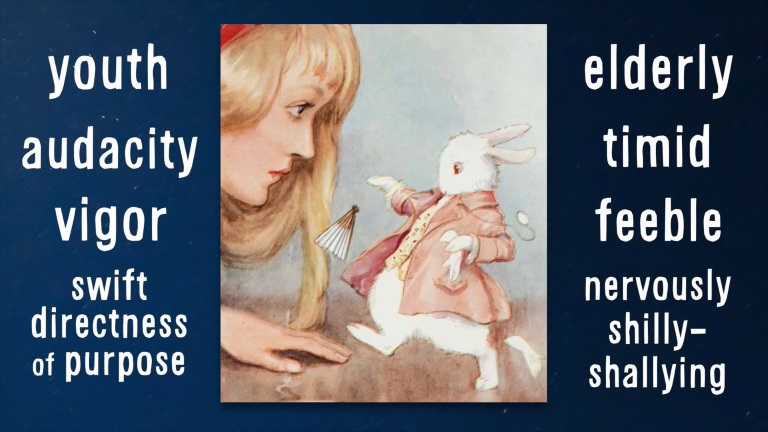 He says Lewis Carroll wrote the rabbit to be the opposite of these four traits of Alice.