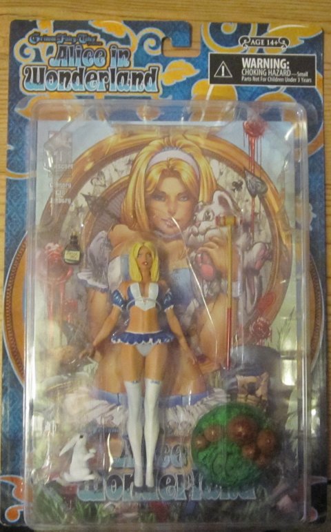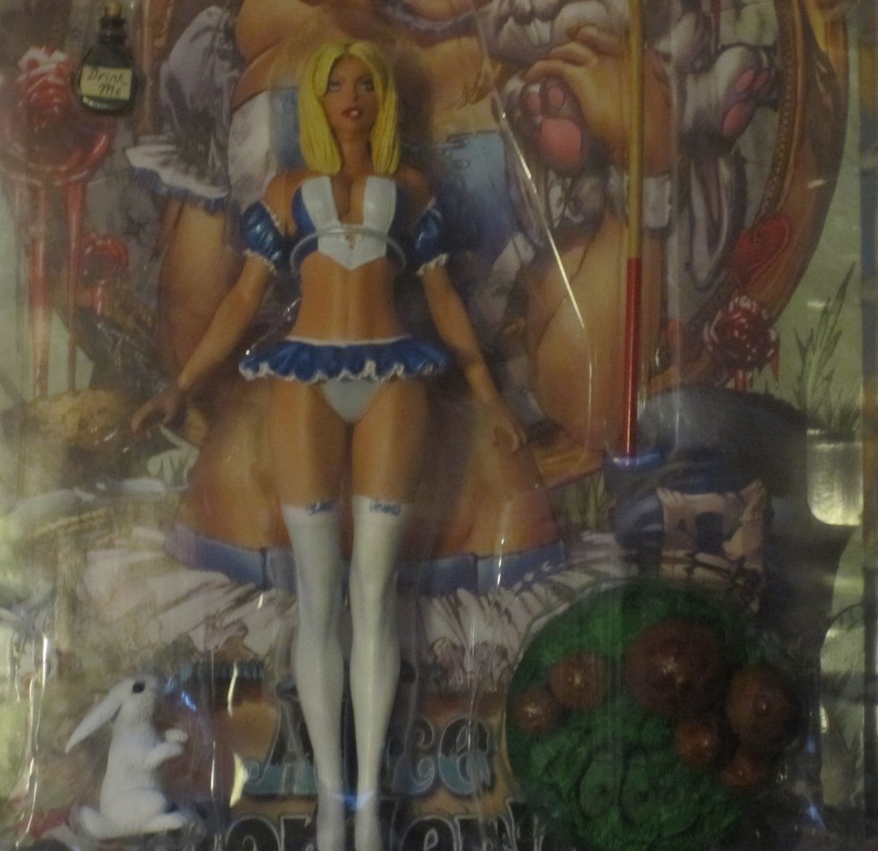 This is put out by the Zenescope group who has done a whole series of comics based on Alice in Wonderland. The comics are not your standard Alice, of course. They are bloody, horror-oriented comics and Alice is not a sweet young girl as the size of the breasts on the doll shows. The doll includes a comic with a cover exclusive to the dolls. There's a bottle that says Drink Me, a croquet mallet, a small white rabbit and a bunch of mushrooms.