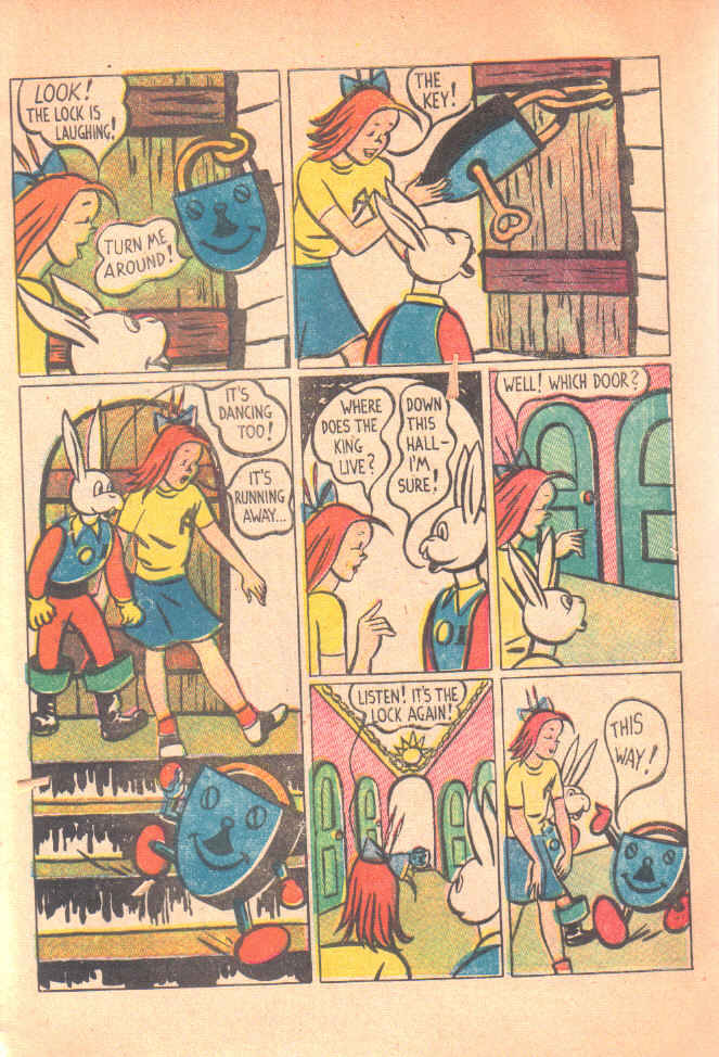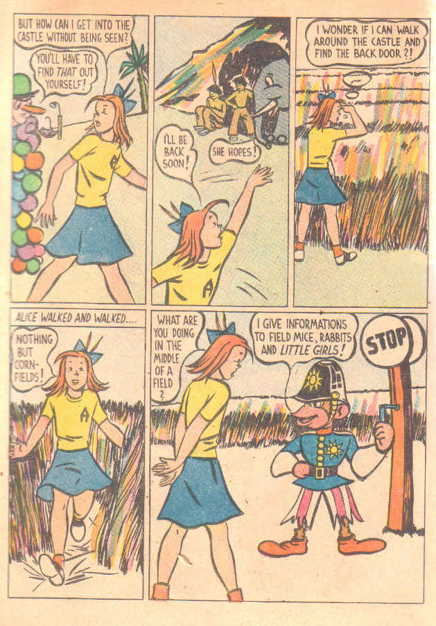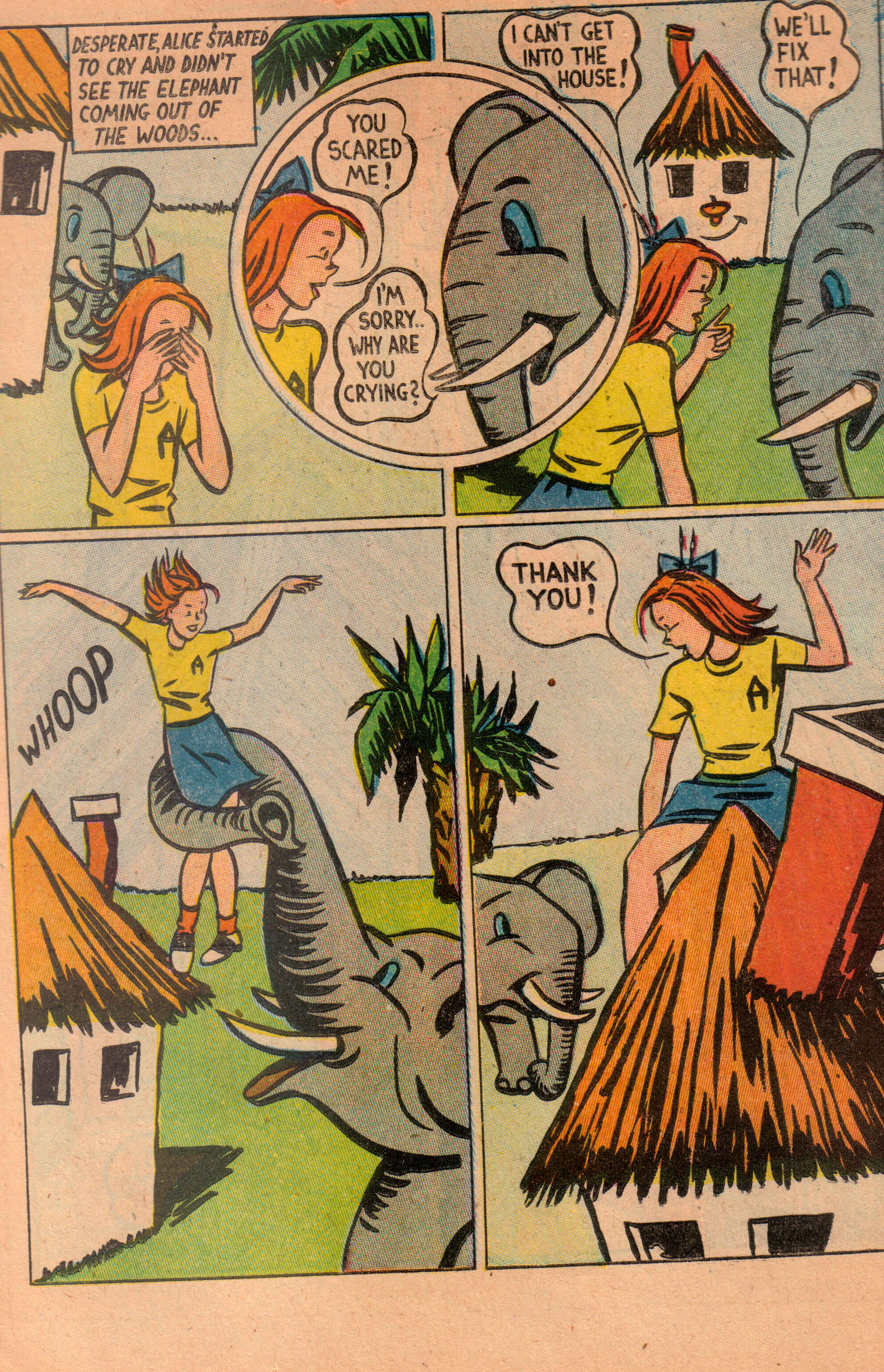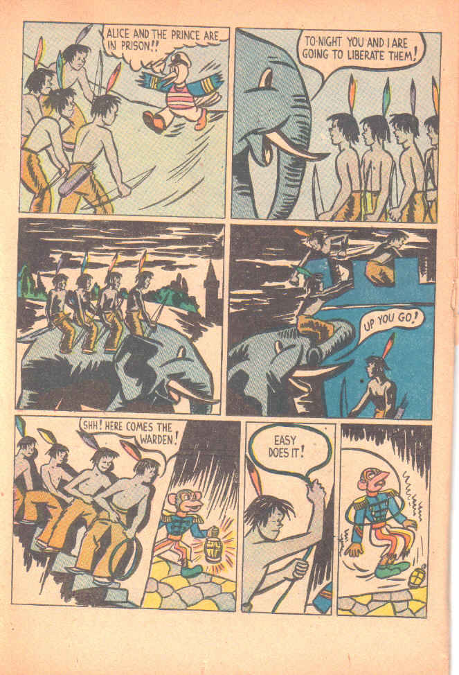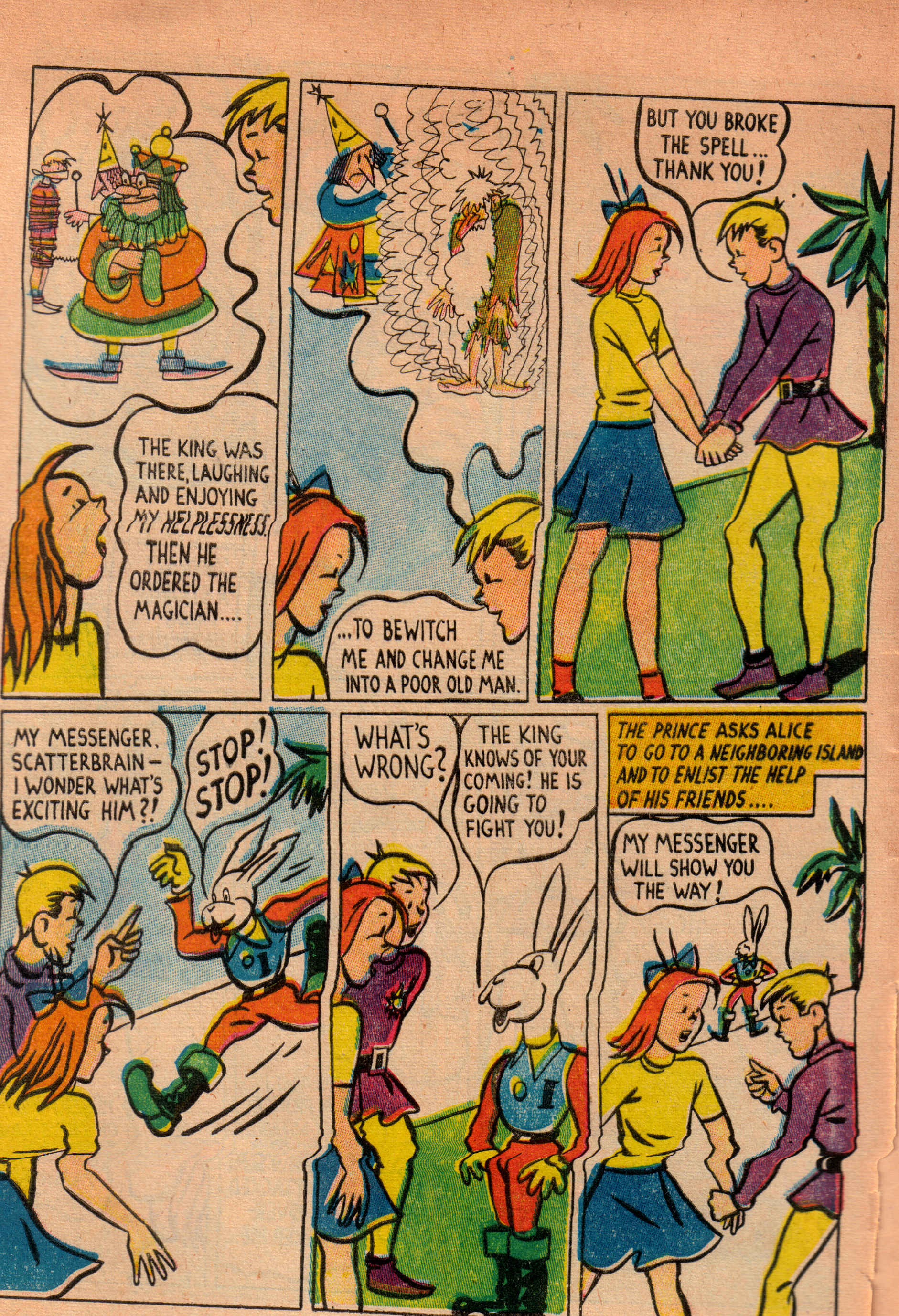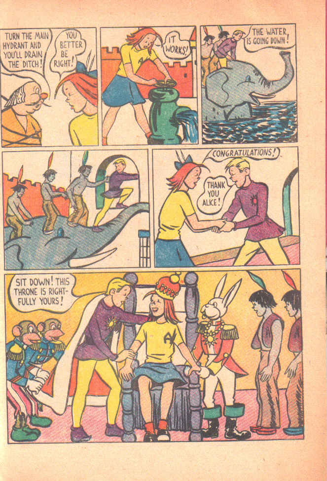 She goes for help for the prince but runs into trouble on another island where she ends up inside a house. Alice meets a number of characters which, while not from the traditional stories, do fit the general tone of those stories. She helps the prince overcome the king in a series of somewhat comical adventures.