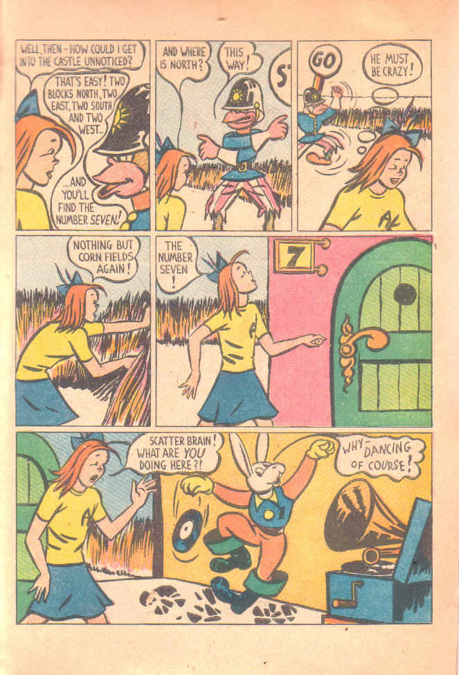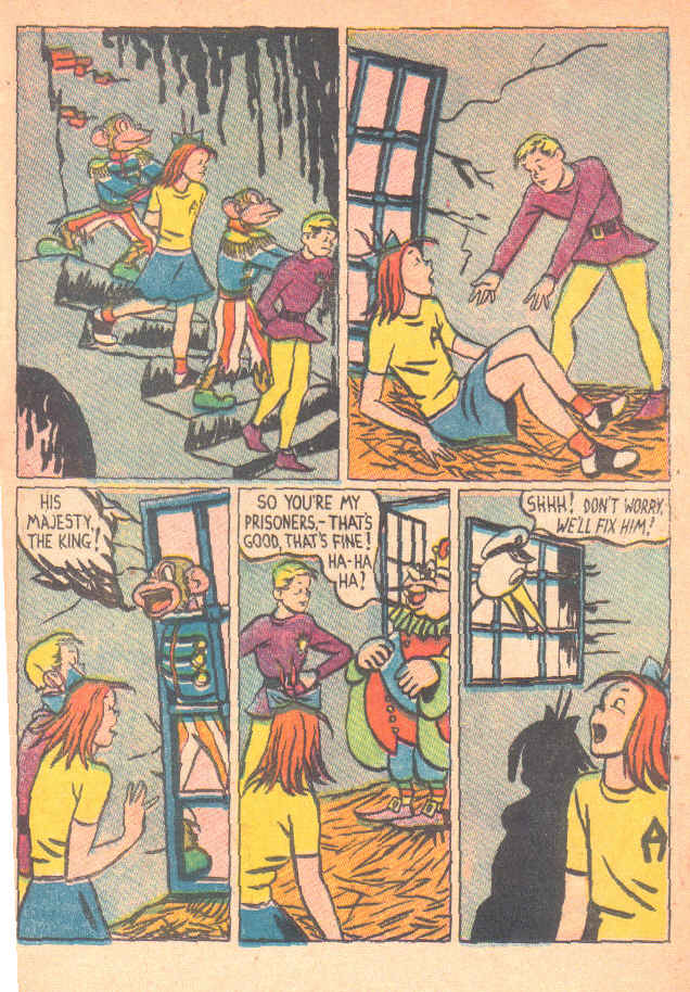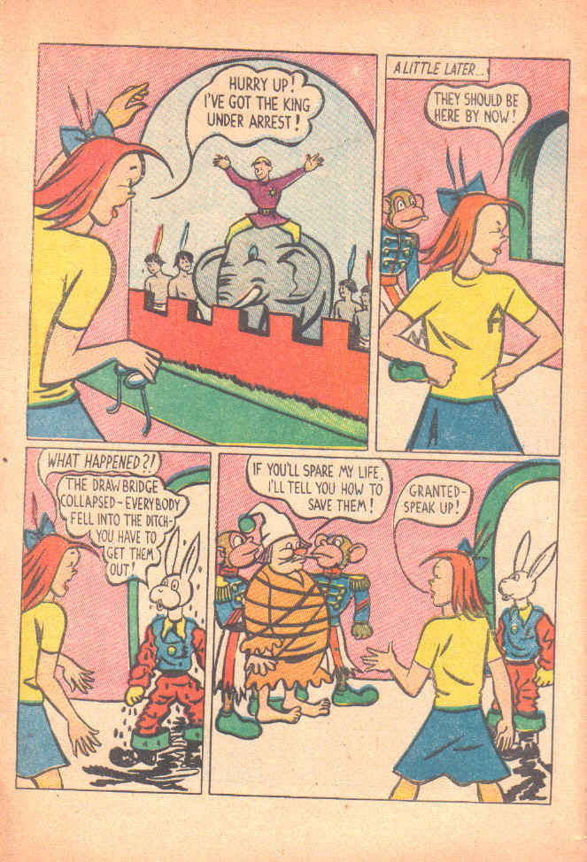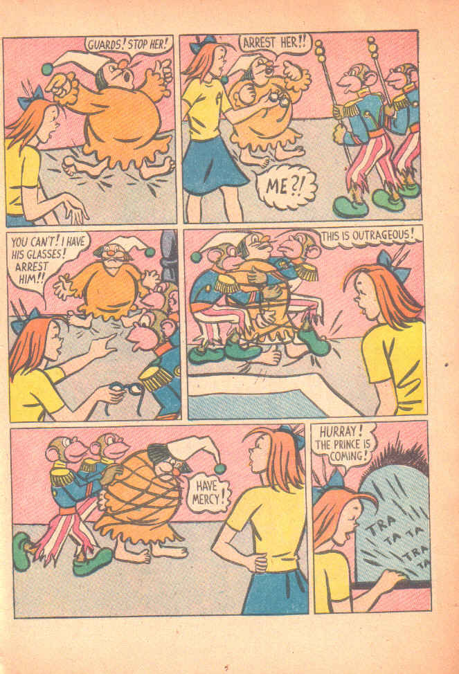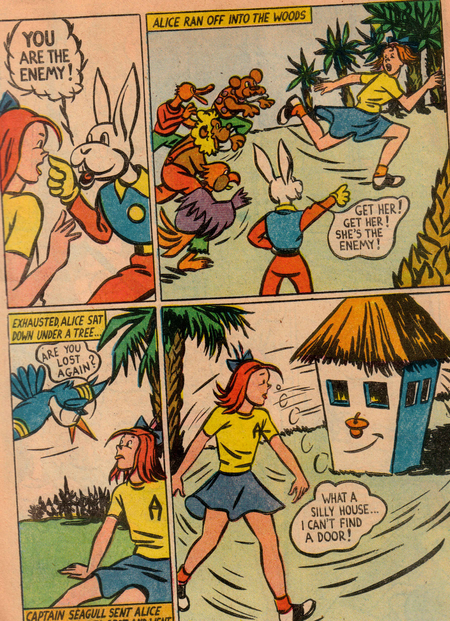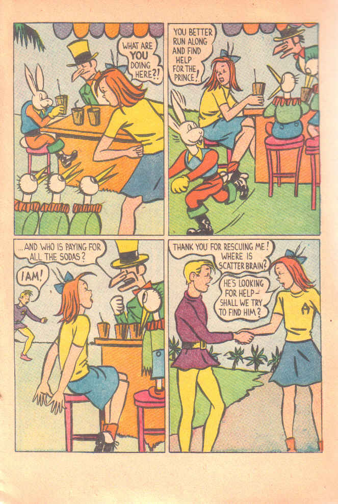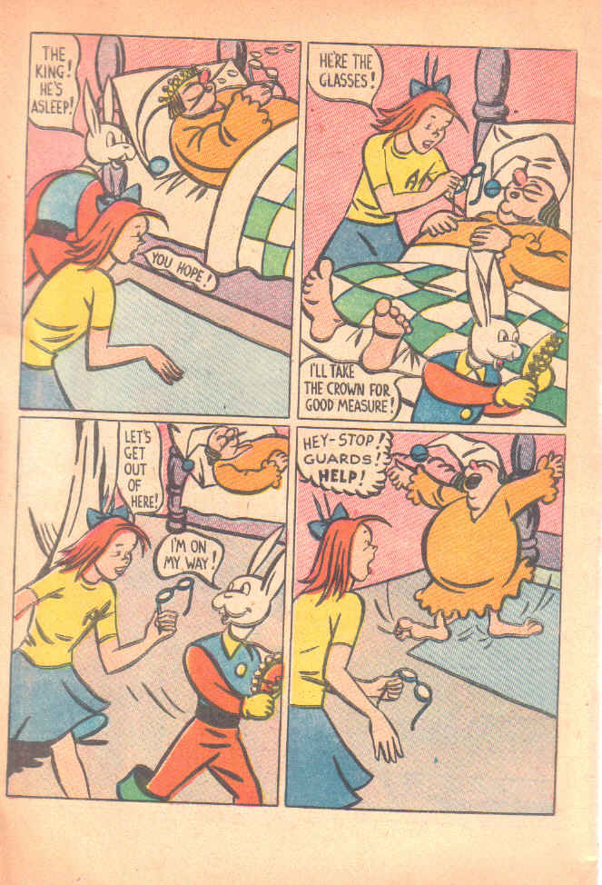 She goes for help for the prince but runs into trouble on another island where she ends up inside a house. Alice meets a number of characters which, while not from the traditional stories, do fit the general tone of those stories. She helps the prince overcome the king in a series of somewhat comical adventures.