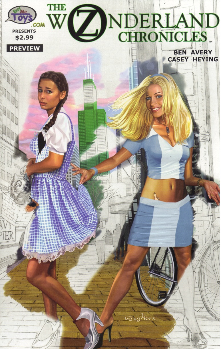 The cover is really neat showing both Alice and Dorothy grown-up. The issue opens with a forward in text about Oz and Alice in Wonderland. Then, in what is definitely a strange way to do such a comic, there is one page of text arranged like it was from a movie script but describing the panels on the second page, which is black and white drawings of the material noted on the left-hand page.