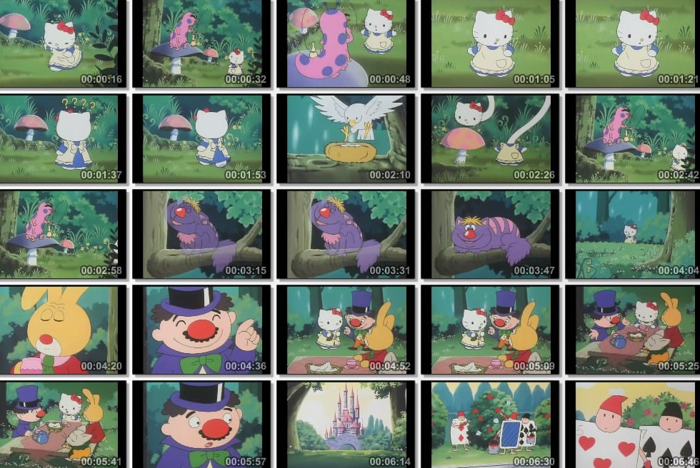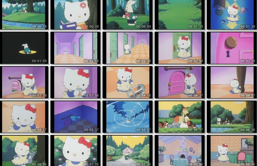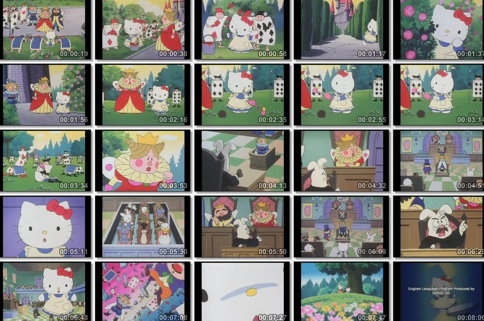 Hello Kitty and her sister are taking the place of Alice and her sister. The older sister notes how Alice/Hello Kitty falls asleep so easily. Then Alice/Hello Kitty spots the White Rabbit. Instead of finding a rabbit hole, though, this Alice is standing in a field and a hole just opens up underneath her.