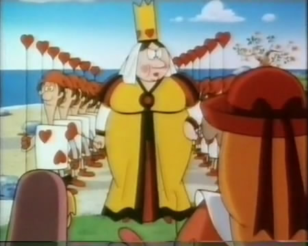 The Queen says all gatherings have to have her position. It's the mouse that explains about un-birthday presents. Oddly enough, the Queen doesn't get angry at Alice right off since, in the first cartoon in the series, she told Alice she was never to return to Wonderland.