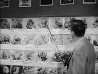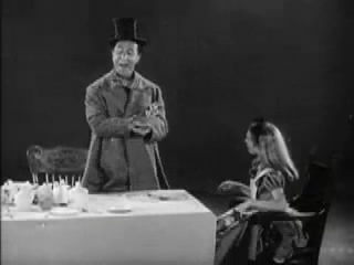 Rehearsing the tea party scene. Ed Wynn wears no makeup, of course. The artists watch how he moves and then they make their sketches. Today Ed Wynn would be fitted with loads and loads of sensors, be filmed before a giant green screen, and a computer would track his every movement. Images would then be produced and altered to make him look like the Mad Hatter.