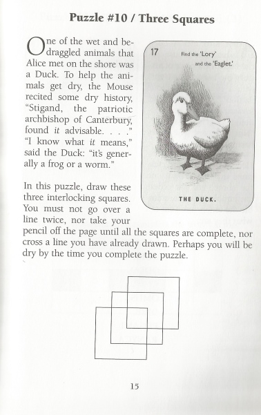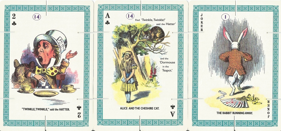 This is a really neat set. First, there's a booklet that has a bunch of puzzles and games of the type that Lewis Carroll was interested in. These themselves are fascinating. Then there's a deck of 54 playing cards, divided into suits and each card has one of the Tenniel and another illustrator, illustrations that have been colored in.