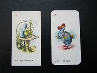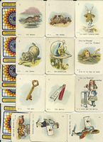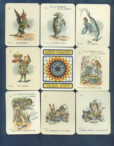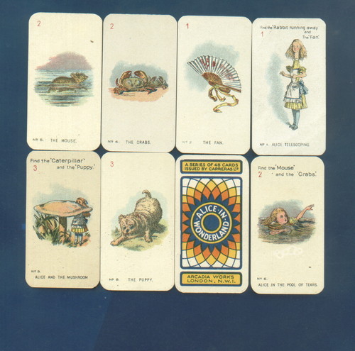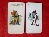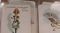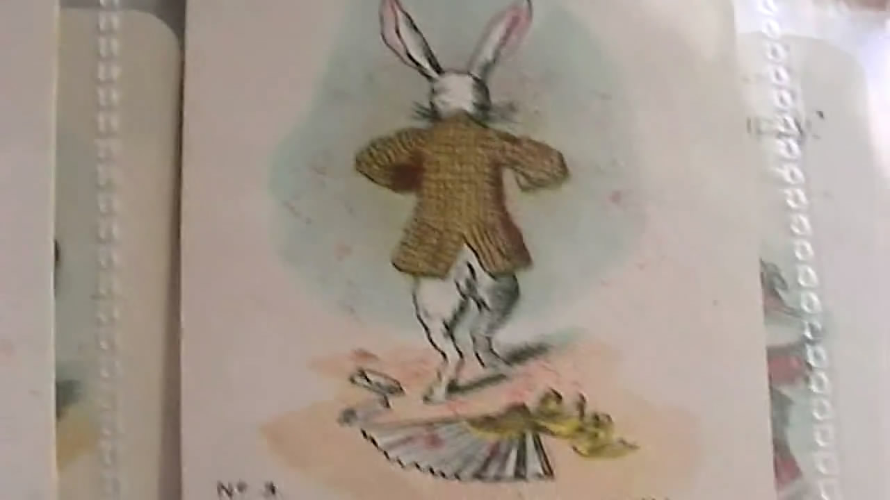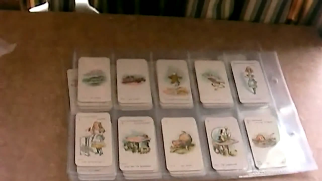 This is a video about Alice in Wonderland cards that it seems came with cigarette packs. They are from the 1930's and came in two different sizes. He shows the various cards in the larger size series which are the same as in the smaller size set.