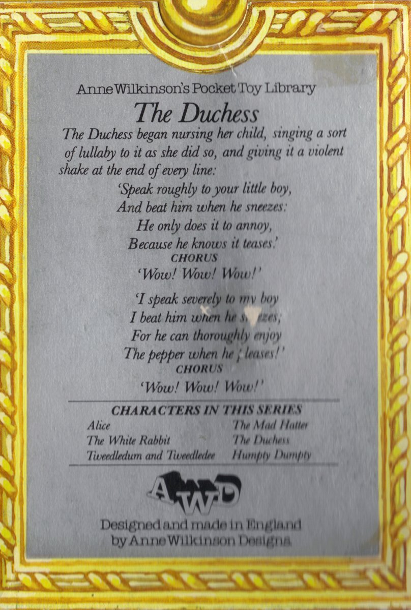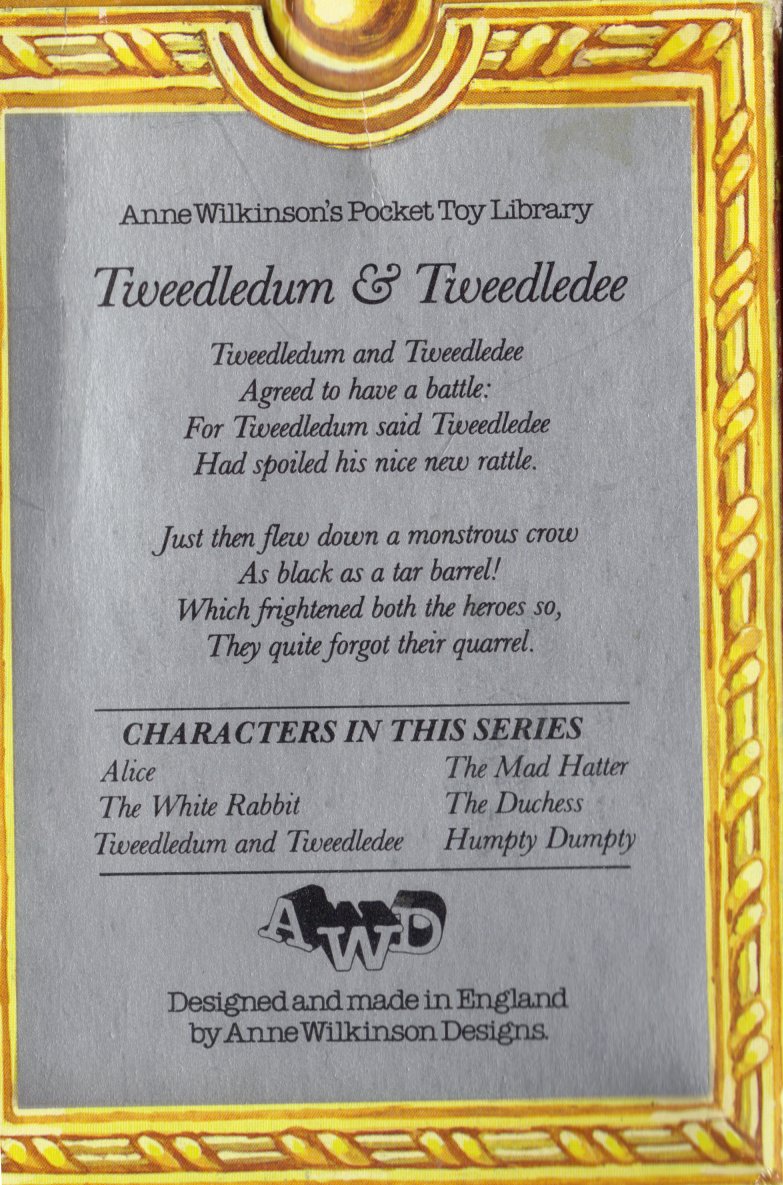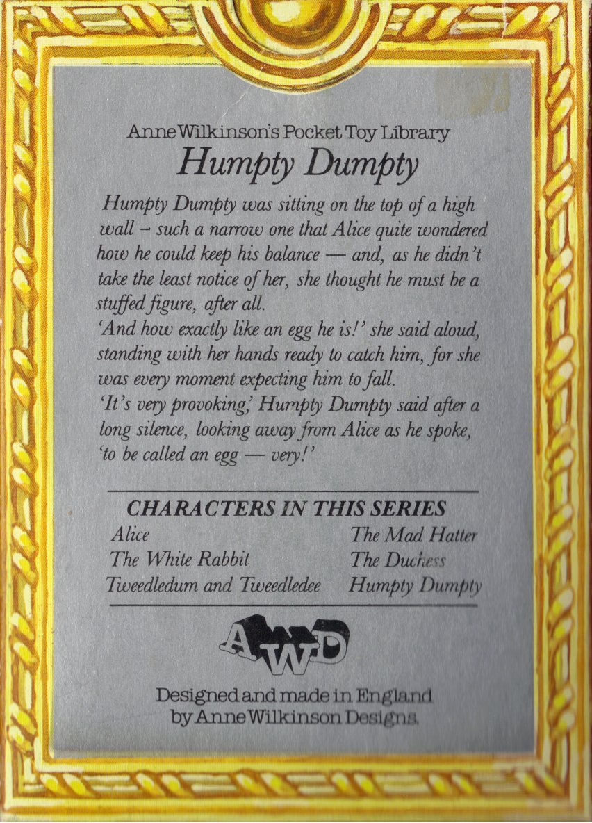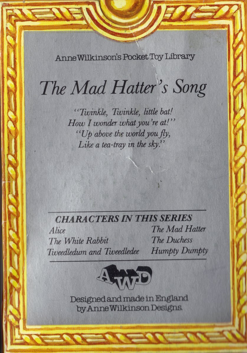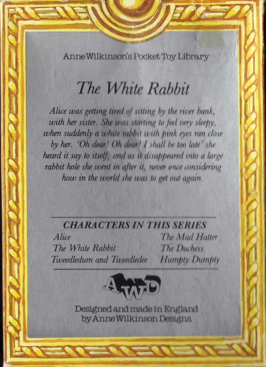 There are six of these in the series. They come in boxes with a poem or something else from the story on the back of the box. These are from England are are from Anne Wilkinson Designs. They seem to be from the late 70's and 80's, the company no longer making them but moving on to soft cloth books.