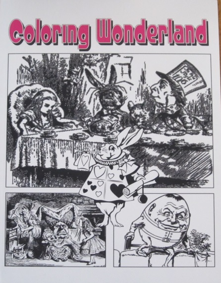 Printed on both sides of a page. Illustrations used are from Tenniel. 'Coloring Wonderland' appears at the top of each page. Under that is a very brief description of what the drawing is about. There are 44 drawings. These would be very difficult to color in and get them to look good since they are the Tenniel drawings.