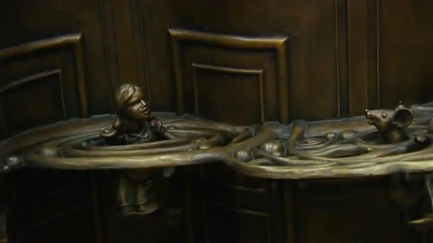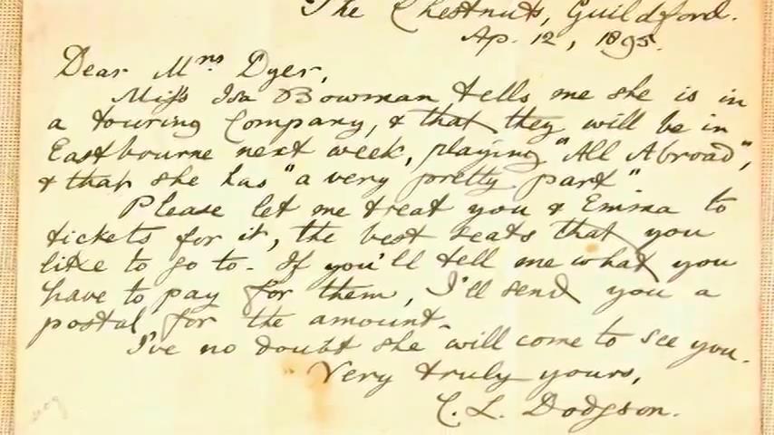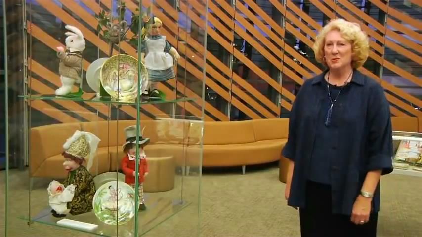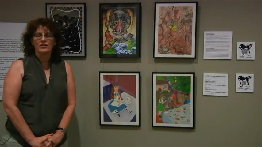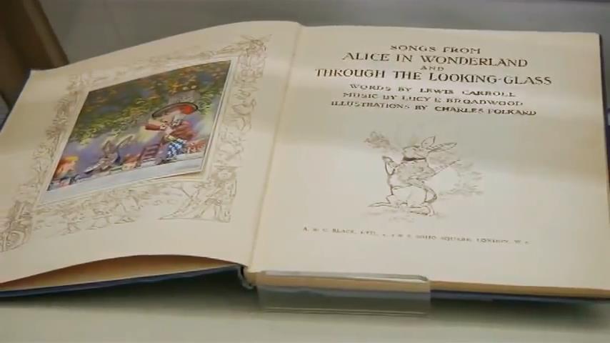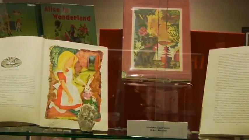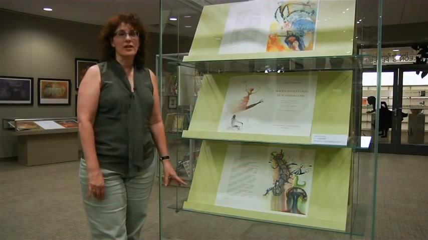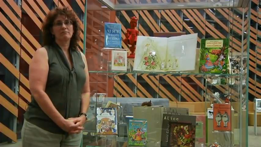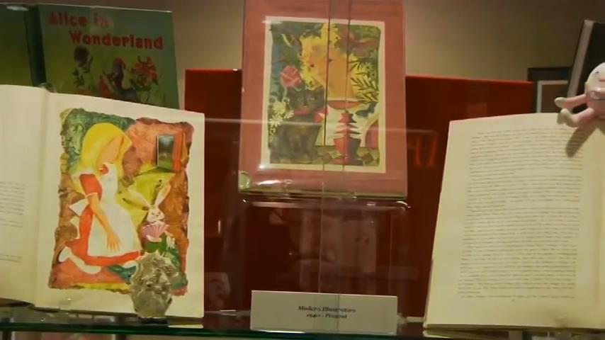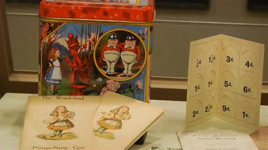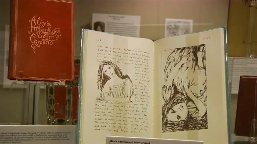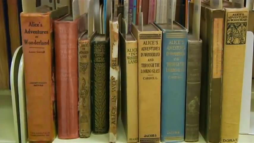 A place is holding an exhibition of Lewis Carroll's works. The narrator talks about Charles Dodgson and his time at the university. Then she talks about how Dodgson made friends with the Liddells. Shown are various exhibits of books, artwork, sculpture, etc. The exhibit has many versions of the original books including those in foreign languages.