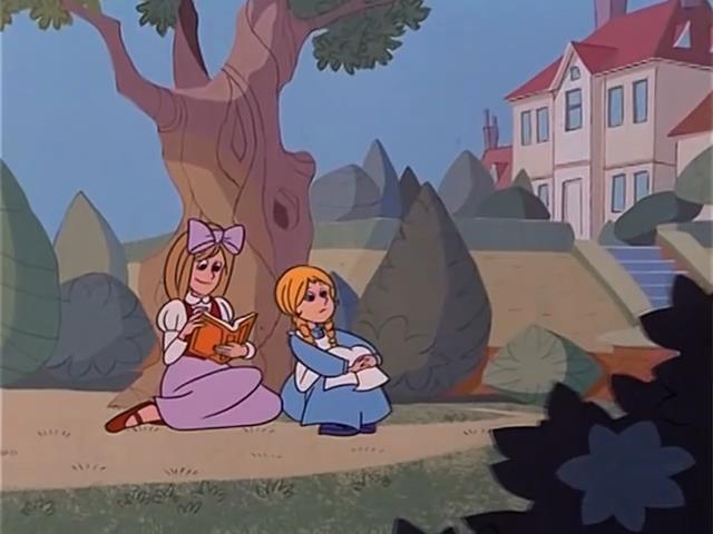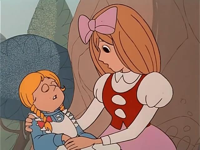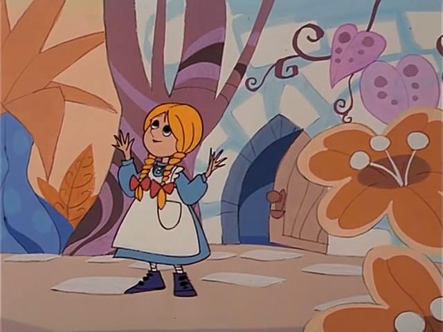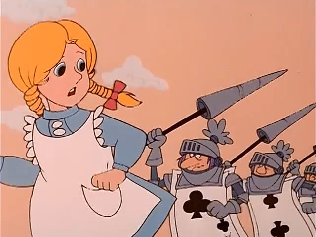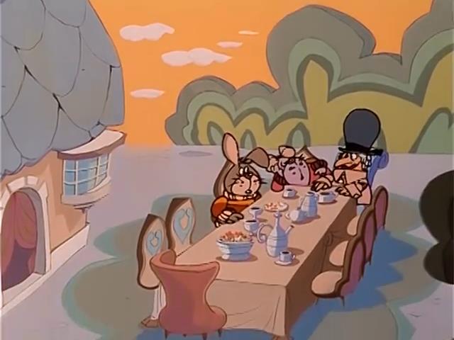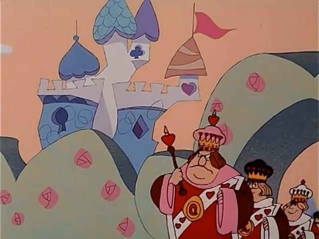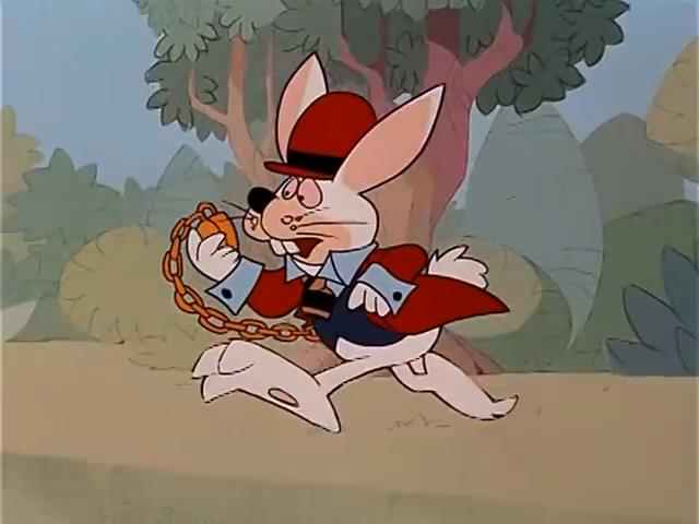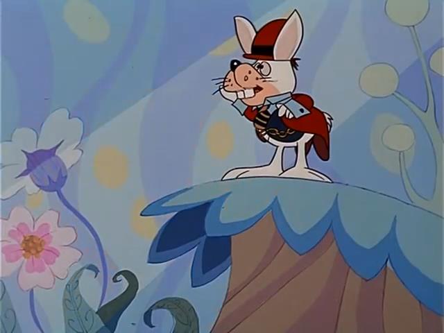 The cartoon starts with Alice looking at a place where birds fly upside down, a bug goes backwards and a chick goes into an egg. The White Rabbit tells her the Queen is holding a picnic (instead of a croquet game.) (This is contradicted after the actual start of the cartoon proper when the rabbit refers to the Queen's croquet game rather than a picnic.)After this then there's the opening of the cartoon.