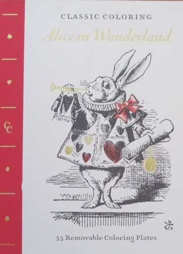 There are 55 removable coloring plates. The art is on one side of a page and the other side has text from the story. The pages also include artwork from Through the Looking Glass. The artwork is the Tenniel art.