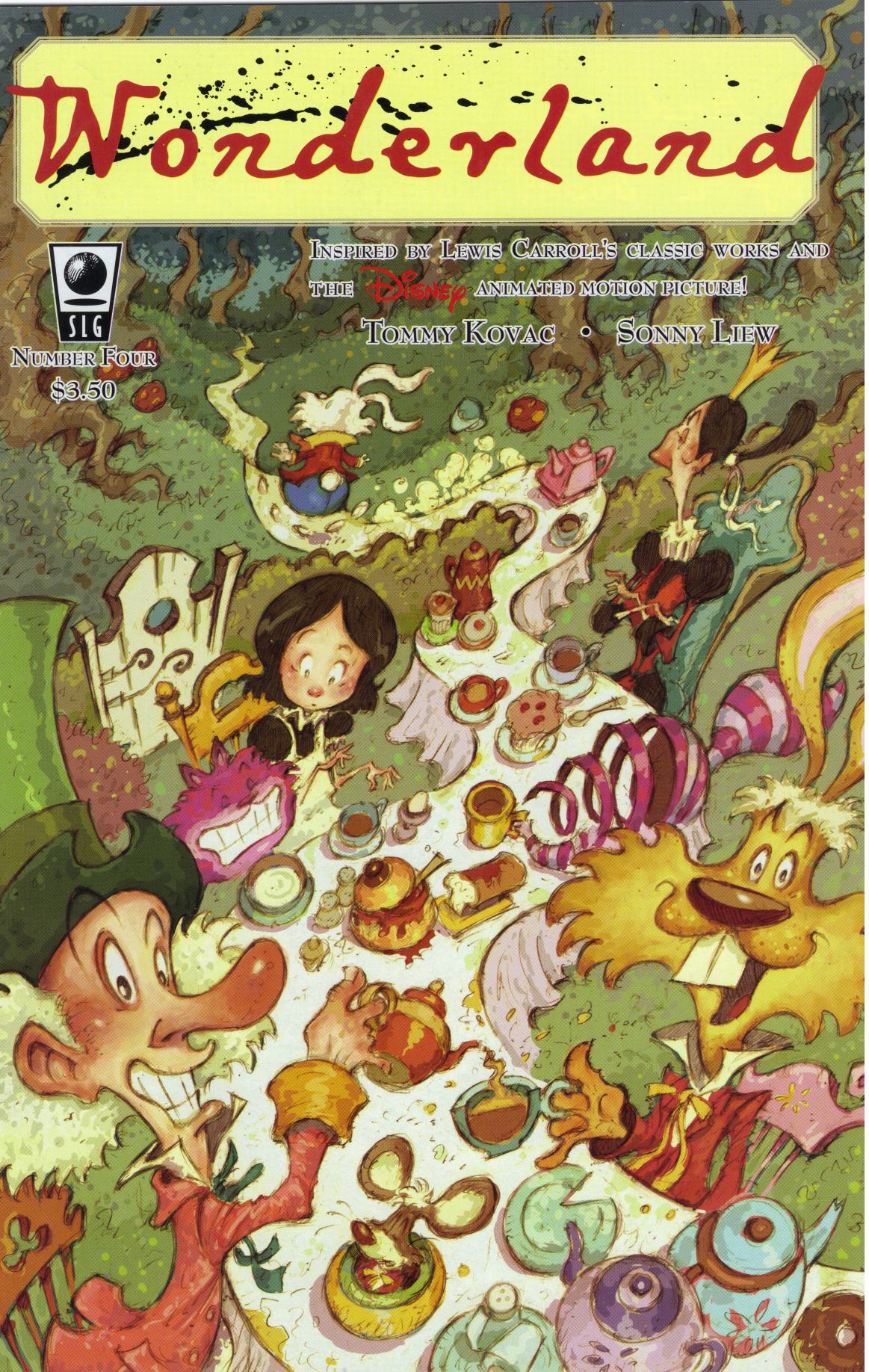 Issue 4: This issue is about a tea party with Mary Ann and the others. There's a funny section where the Cheshire Cat chases the Dormouse, and more fun with the 'Alice monster' references. There's also more emphasis on Mary Ann's obsession about keeping things clean, messing up the tea party to make sure the dishes are properly clean.