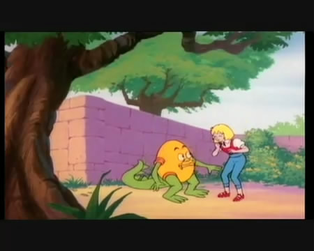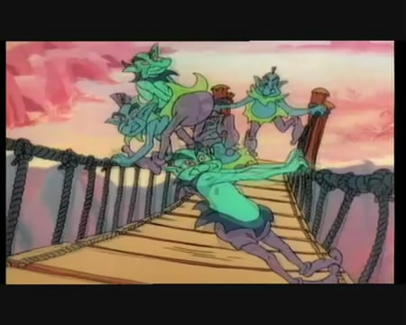 She's trying to cross a hanging bridge when a bunch of creatures get on and try to shake her off.