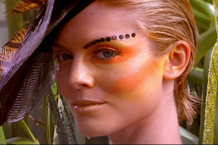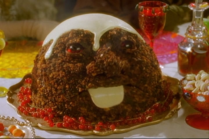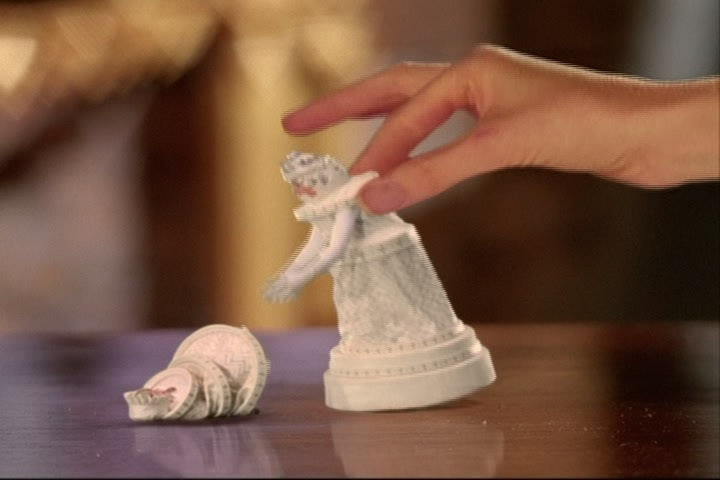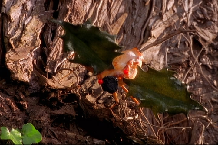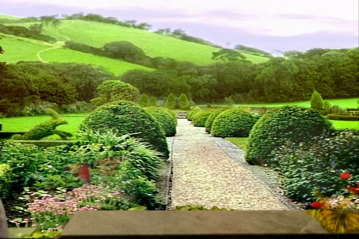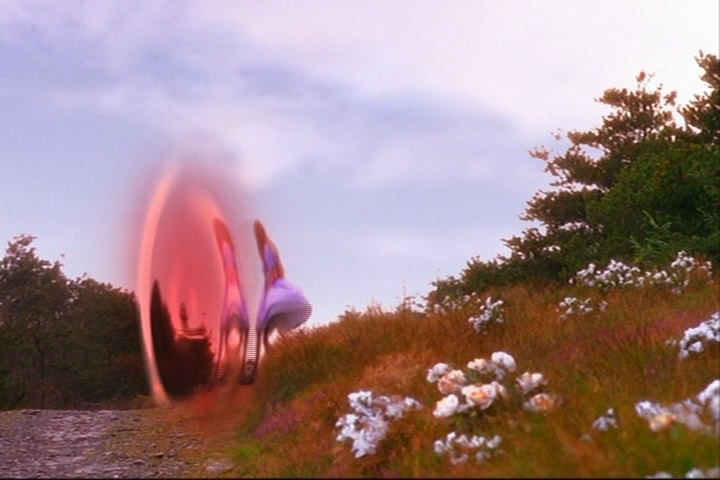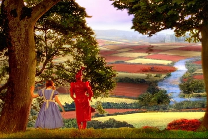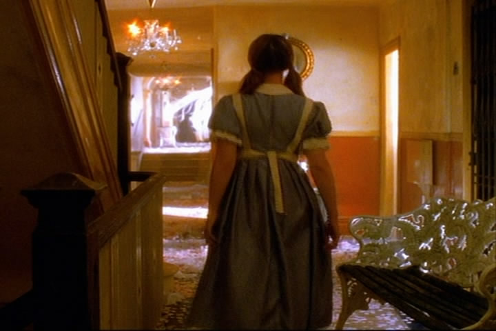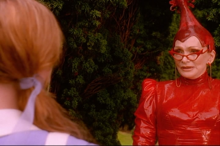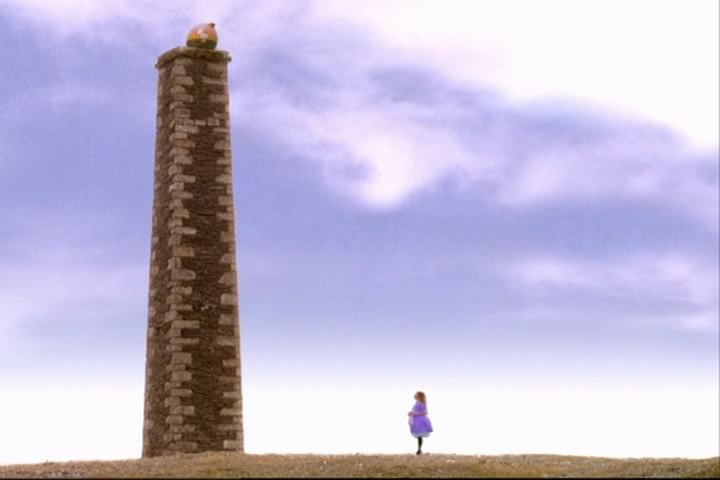 Alice goes outside the house. The photography in this movie is excellent, the color very rich. Alice, by the way, has suddenly sprouted wings, explaining how she can fly.