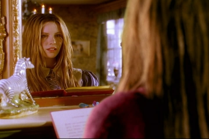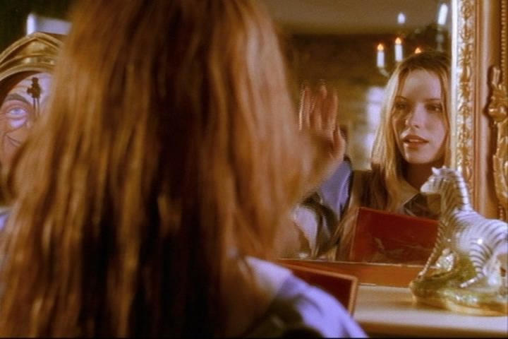 The daughter gets her mother to look at the mirror and believe and, when she does, she sees a different room. The mother in the mirror is wearing a different dress.