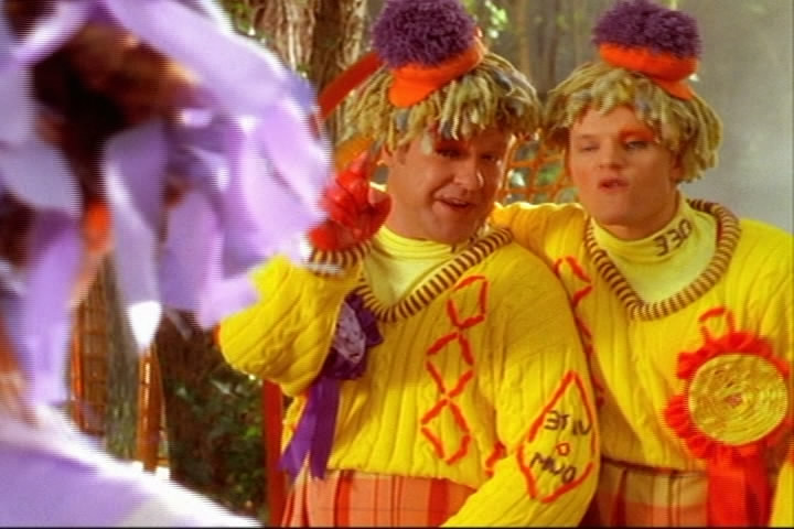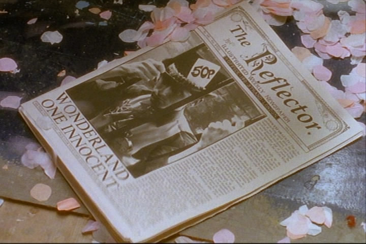 The Tweedles. Notice that their names are spelled backwards which makes sense considering writing from our side appears as backwards writing on theirs. Also, Alice suddenly has a lot of purple ribbons entwined in her hair.