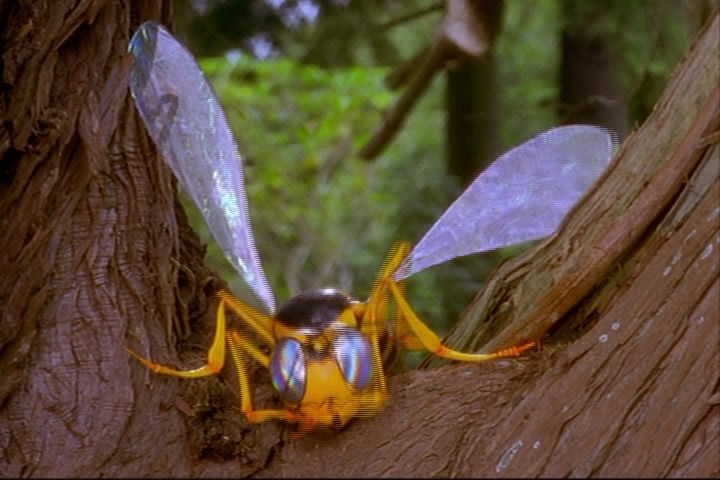 An invisible wasp talks to her while she's on the train. Then something happens and she's off the train, but the wasp is still with her.