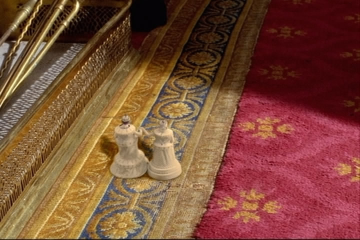 The movie sticks with the traditional story where Alice helps the White Queen up to the table to be with the pawn baby.