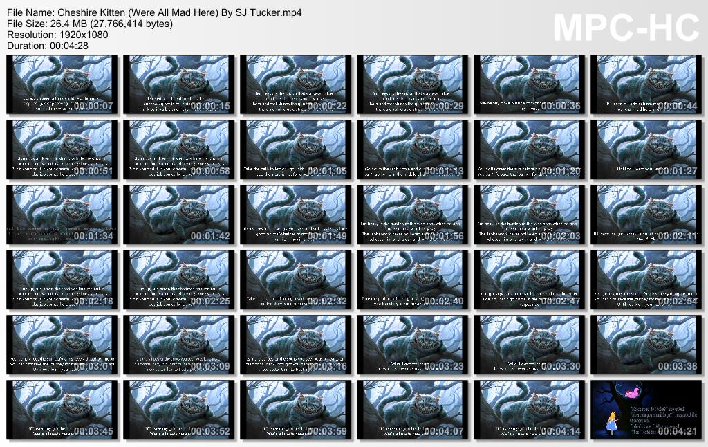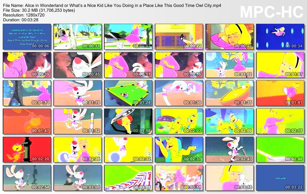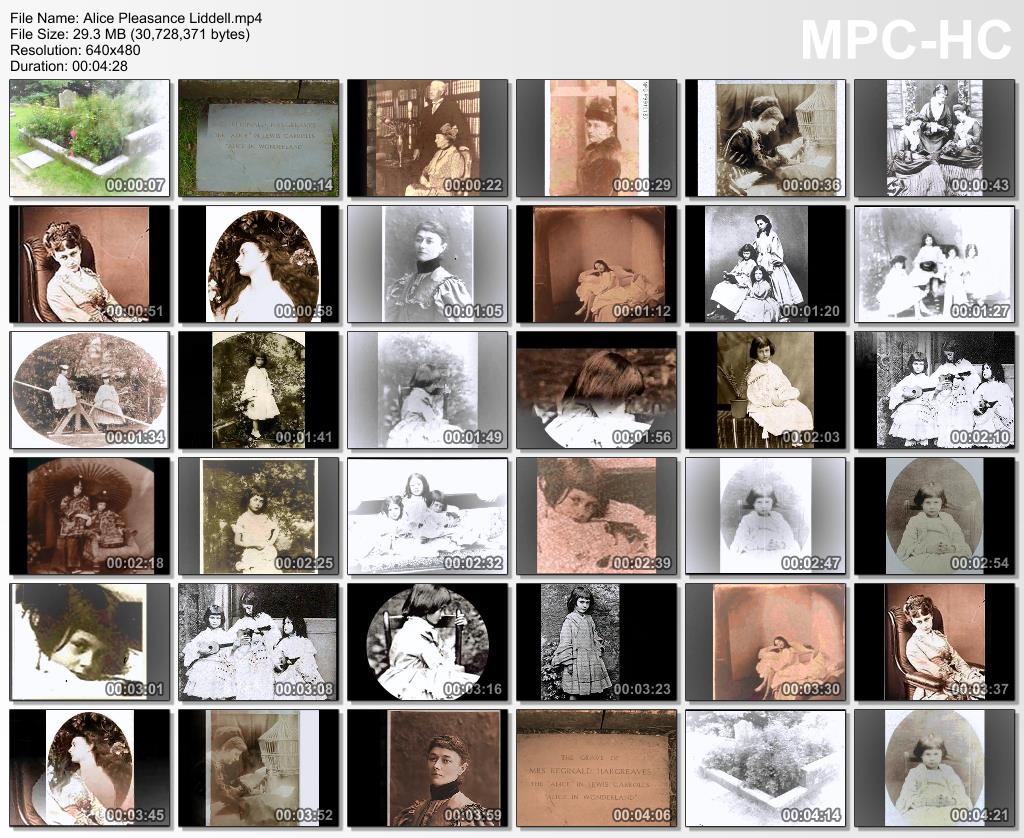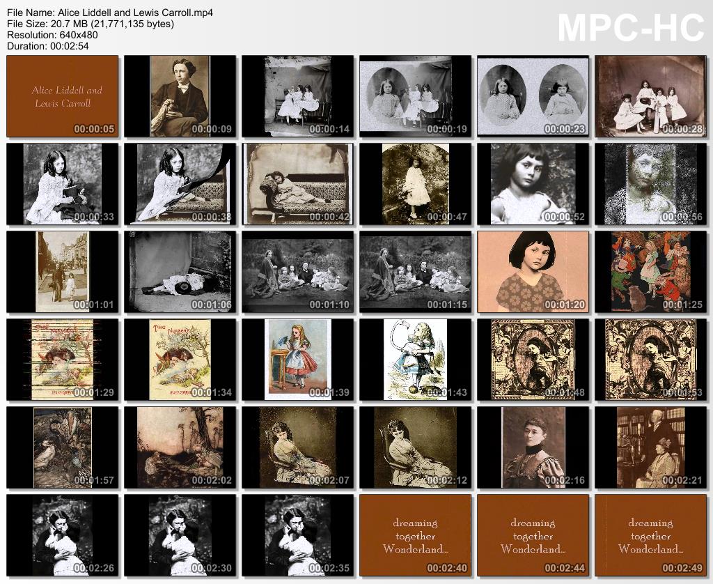 Photos of Dodgson and Alice followed by artwork from various Alice in Wonderland publications. There's also a musical background.