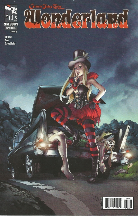 Issue 11: In Wonderland the Queen of Spades is planning another war. Callie and Violet are still driving, trying to escape Wonderland's influence. A woman realizes the dangers of hitchhiking. There's an oddity in a couple of panels. In the panel at the top of one page a woman is driving, the steering wheel being on the left. In the bottom panel the man is driving and the steering wheel is on the right side (as looking from inside the car.)