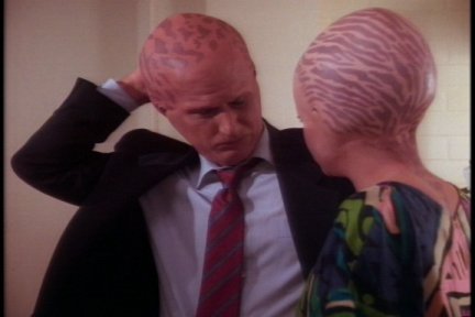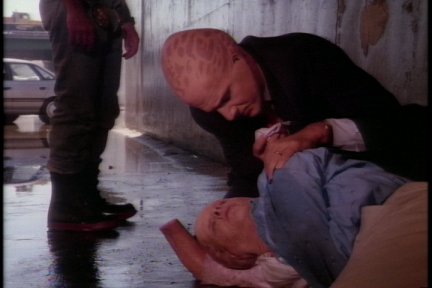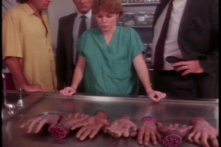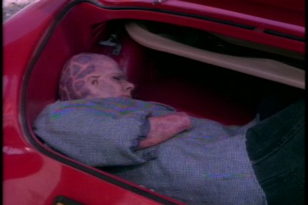 An elderly couple are at a used-car dealership. The dealer opens the trunk of the car he's trying to sell them and there's a dead Newcomer inside with his hands cut off.