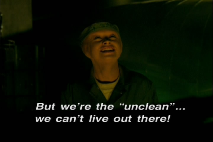 One of the female Eeno escapes but not of the aliens will help her. They even turn their faces away from her. The girl gets shot but no one helps her. When called to the site George calls the girl a creature, 'not worth a second of their time.'