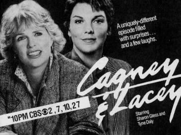 Cagney & Lacey stars Sharon Gless as slim, blond Chris Cagney, the one in the nice sweaters, and Tyne Daly as dumpy little Mary Beth Lacey, the Irish yente with the flat-footed waddle and endlessly nagging voice. Lacey is always trying to adopt abandoned babies; she's a homey kind of gal, with a husband names Harvey keeping the lasagna warm back in Queens. Cagney, on the other hand, is a tough, independent soul who dates classy playwrights in white scarves. What a wacky pair!