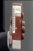 He picks up one model and starts talking about the lighted sign for more selling efficiency, the objects corners, etc. He talks about the 'design balance' of the line of vending machines and their 'crisp, clean look.'