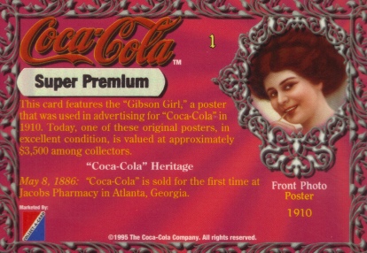 The back of the cards show the year the artwork is from, some general information, and some specific information relating to Coca-Cola. Alas, the choice of colors on the back of the cards were not always the wisest. This one has a light yellow print on a bright red background, making it almost impossible to read. There are also some other combinations that don't work well at all.