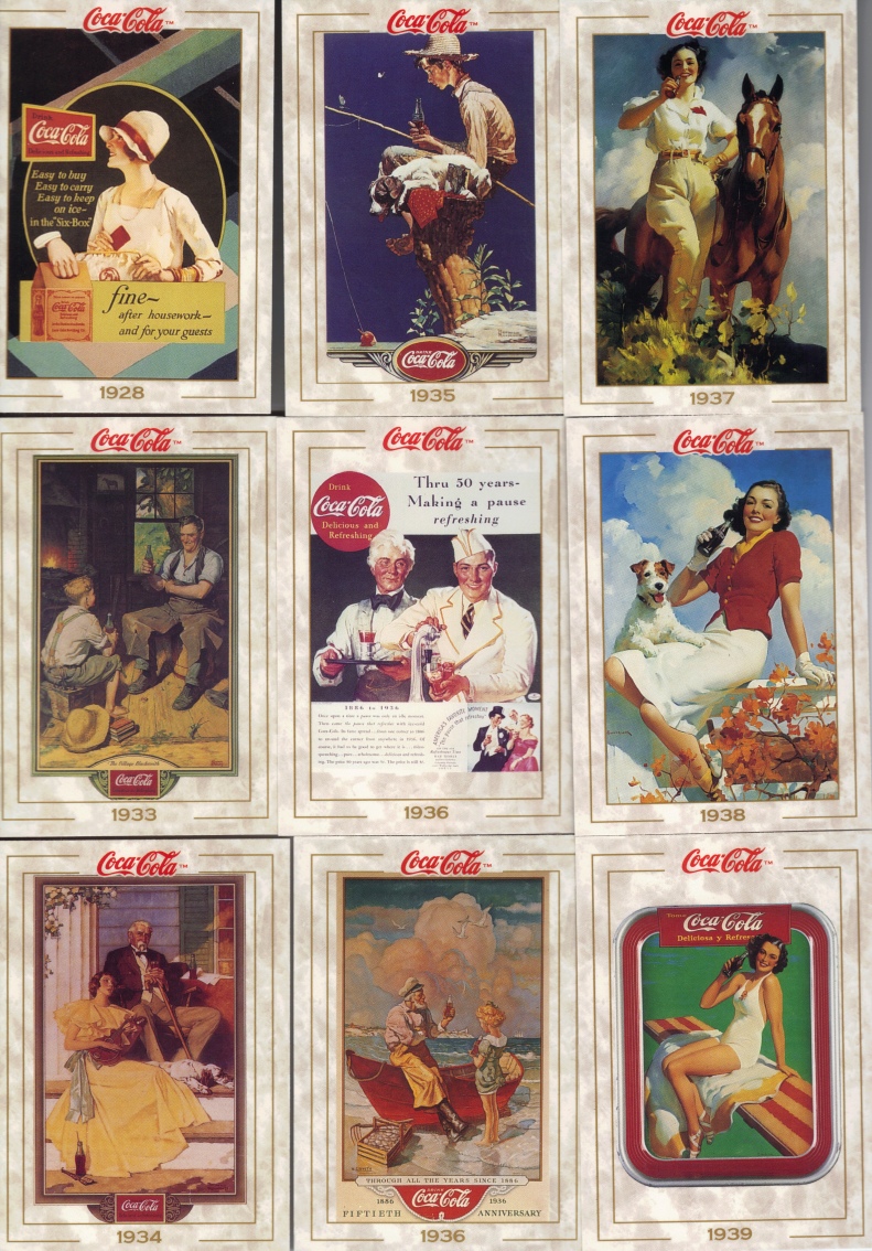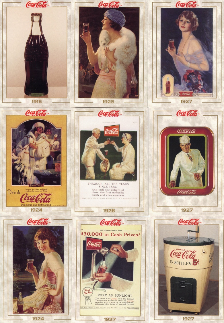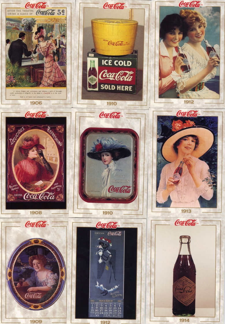 The 1914 card shows one of the early Coca Cola bottles. A number of the cards show the beautiful artwork of women that was used often in ads. Trays are shown on two of the cards, and a calendar on one of them.
