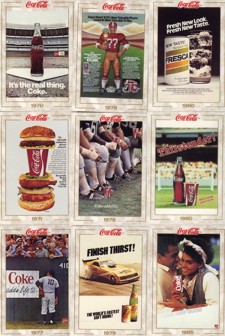 The 1987 card shows an ad that was geared towards the Hispanic population. Three of the others deal with sports.
