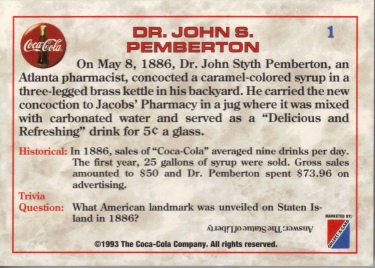 These cards are different from the later two sets. Each card in this set has the date on the front. On the back it has a historical fact related to Coca-Cola, and then has a trivia question.