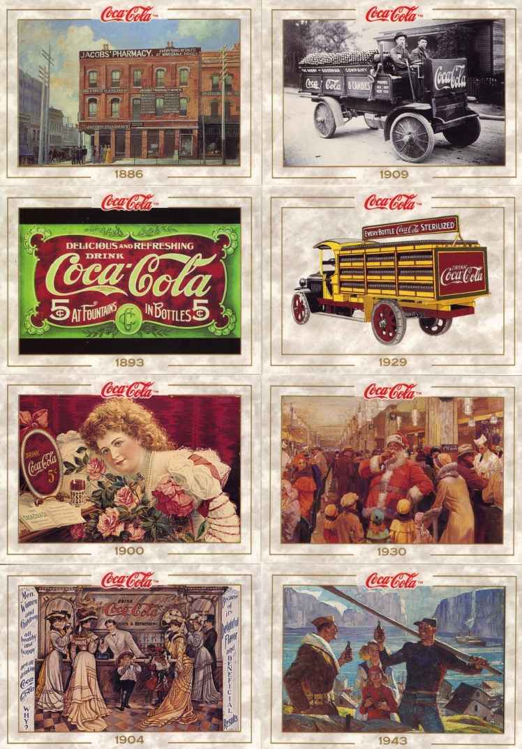 Here are eight more cards in the set. The 1900 shows typical Cola-Cola Girl artwork. The 1909 card shows a strange-looking truck. The name Coca-Cola is all over the truck, making it a moving ad for the company.