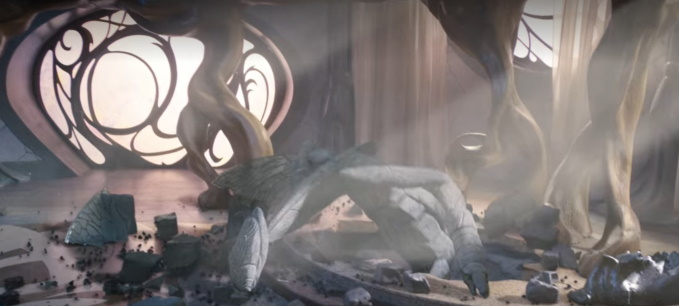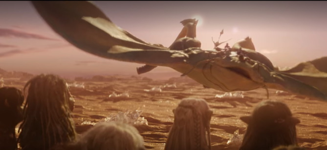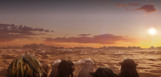 Seladon's grab for power runs into a snag. Meanwhile some kind of flying shark-like thing is seen by Rian and his group. A desert Gelfling talks to the group. They want to go to the Circle of the Sun which the desert Gelfling refers to as a cursed ruin.