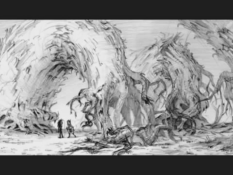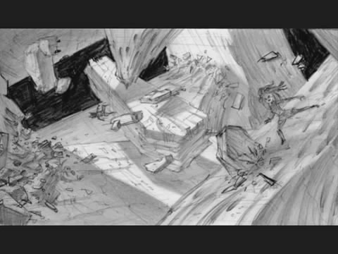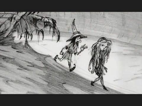 Some drawing board sketches of scenes from the movie, along with images of Jen and Kira when they have gotten much older.