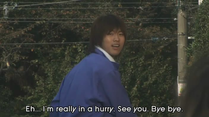 His bike tips over and Momo appears to him.