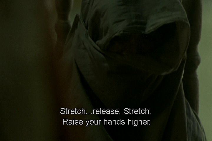 The girl is given dancing lessons by someone who is totally cloaked. The guys treat Gnod, the cloaked person, badly, and the young girl brings him some food after the other guys say he can't have any supper.