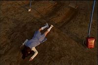 He relives another event in his past when he threw a rock at a girl who was swinging and she fell out of the swing.
