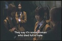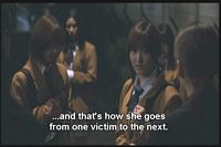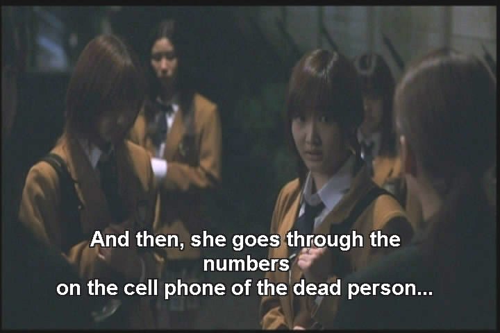 Yumi talks to some other girls. They tell her that a girl that supposedly drowned had gotten a similar call from ehrself on her cell phone prior to her death.