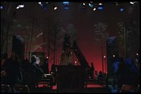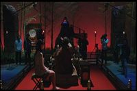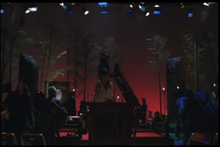 It turns out to be an incoming message for her. The lights go out, and something comes down from the ceiling. (The image was so very dark I had to lighten it a lot in order to actually be able to see anything.)