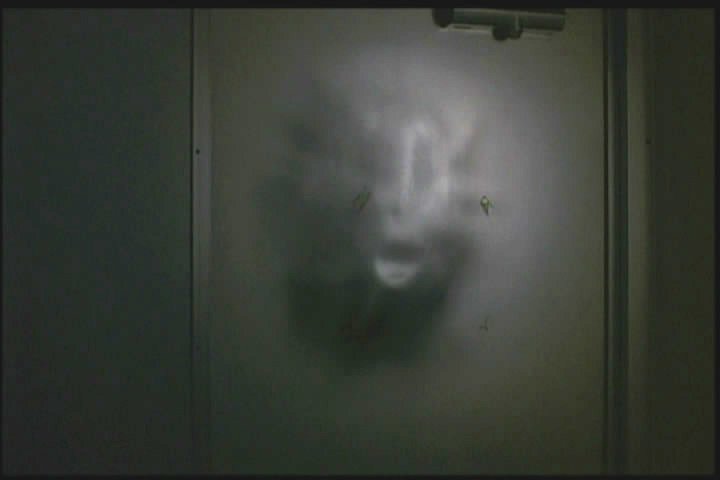 They try to get out a door but it's chained. A face seems to impact the door.