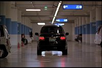A car almost runs her down in a parking garage. (Of course, you really shouldn't walk in the middle of the lane when you are in a parking garage in the first place.)