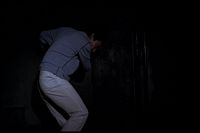 The husband realizes something is wrong. He uses his cell phone to call his daughter's cell phone and he hears it behind the basement door. He goes down into the basement even though the electricity has gone out.