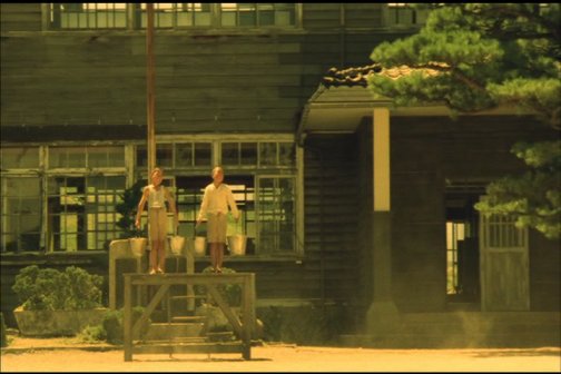 Two boys being punished for something. The students are sent to the hall (or in this case outside) to hold two buckets of water.